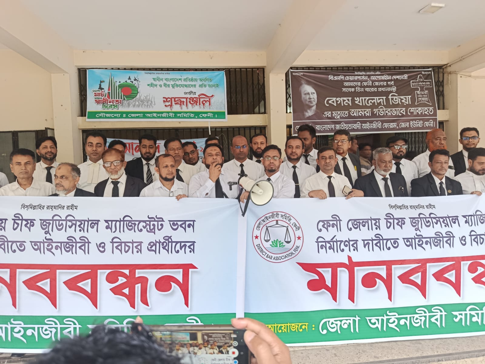 ফেনীতে চীফ জুডিসিয়াল ম্যাজিস্ট্রেট ভবন নির্মাণের দাবিতে আইনজীবী সমিতির মানববন্ধন